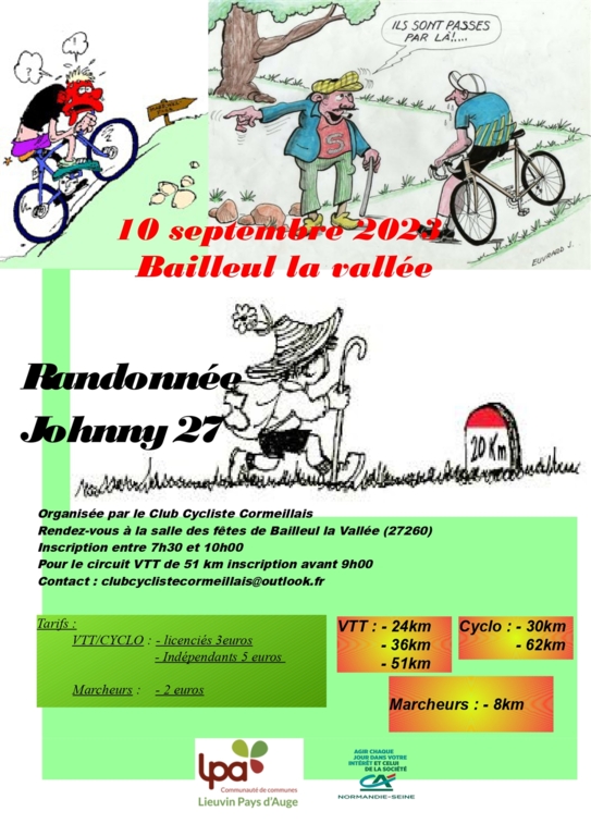 Le club cycliste Cormeillais organise sa randonnée "La Johnny 27" le 10 Septembre 2023 au départ de Bailleul la Vallée.